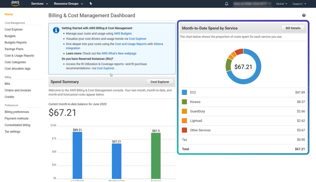 Use the AWS Billing & Cost Management dashboard to pay your AWS bill, monitor your usage, and analyze and control your costs.