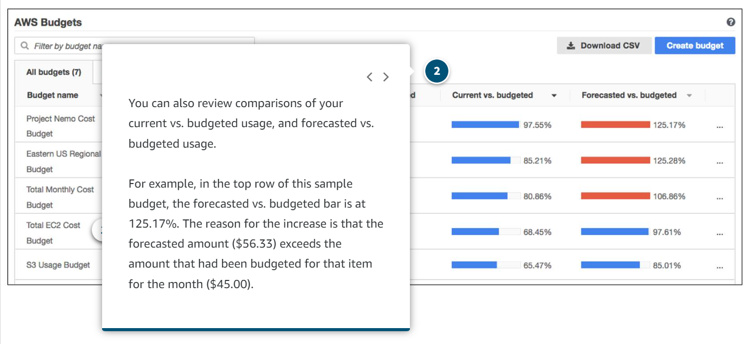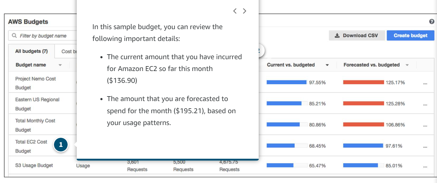 In AWS Budgets, you can also set custom alerts when your usage exceeds (or is forecasted to exceed) the budgeted amount.