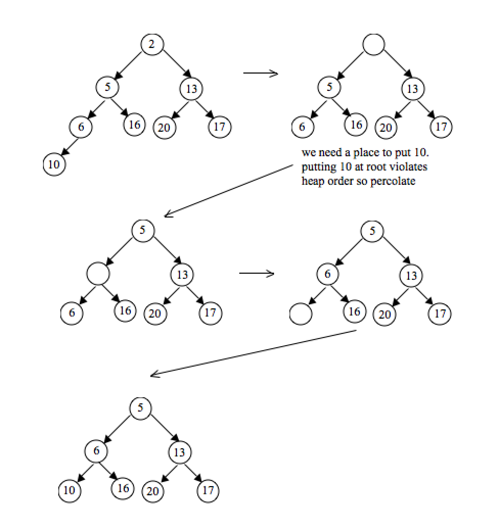 First, we remove the minimum element and swap it with the last element in a heap (the bottommost, rightmost element) Then, we bubble down this element, swapping it with one of its children until the min-heap property is restored.