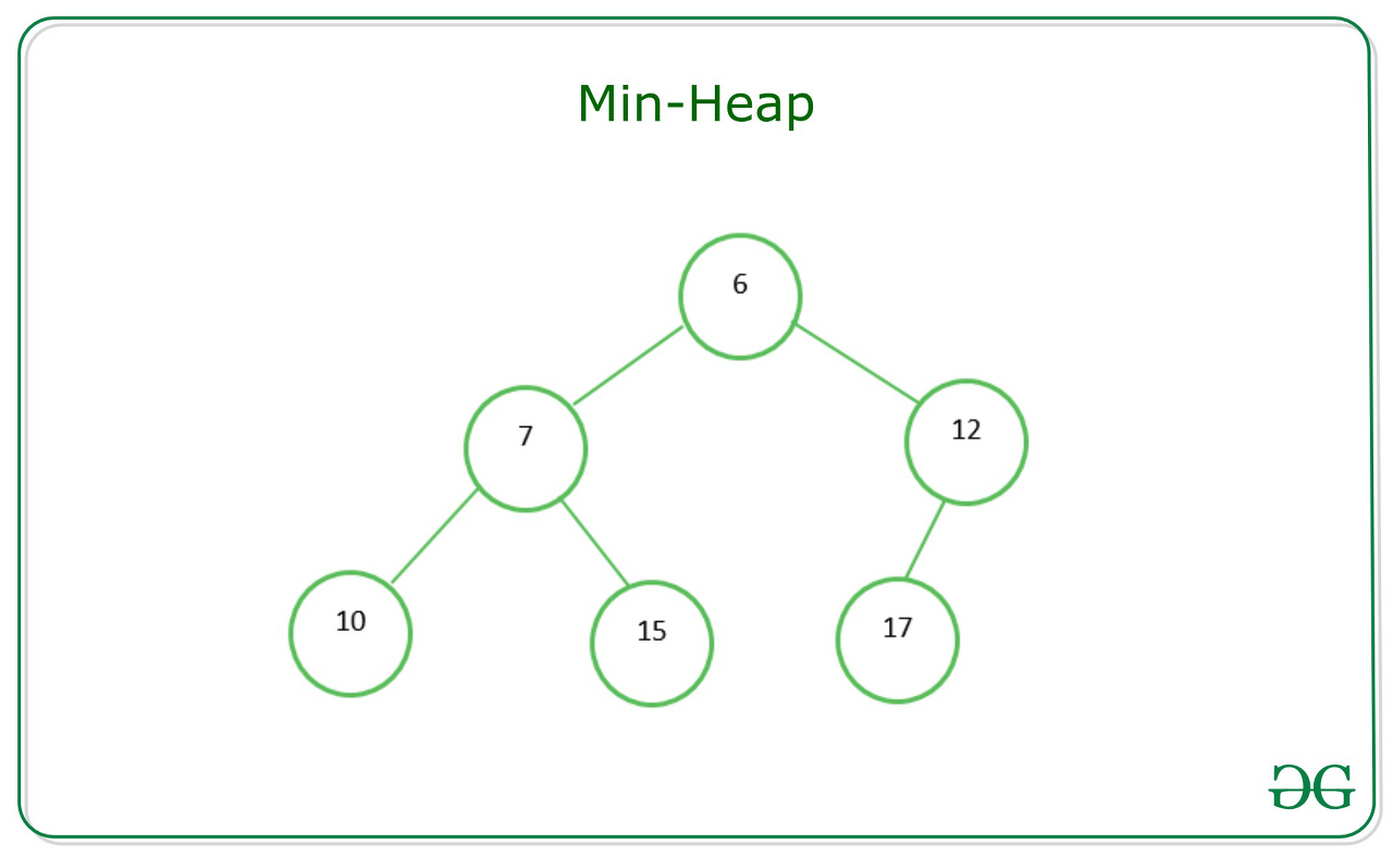 Min Heap: A complete binary tree (that is filled other than the rightmost elements on the last level) where each node is smaller than its children. The root, therefore, is the minimum element in the tree.