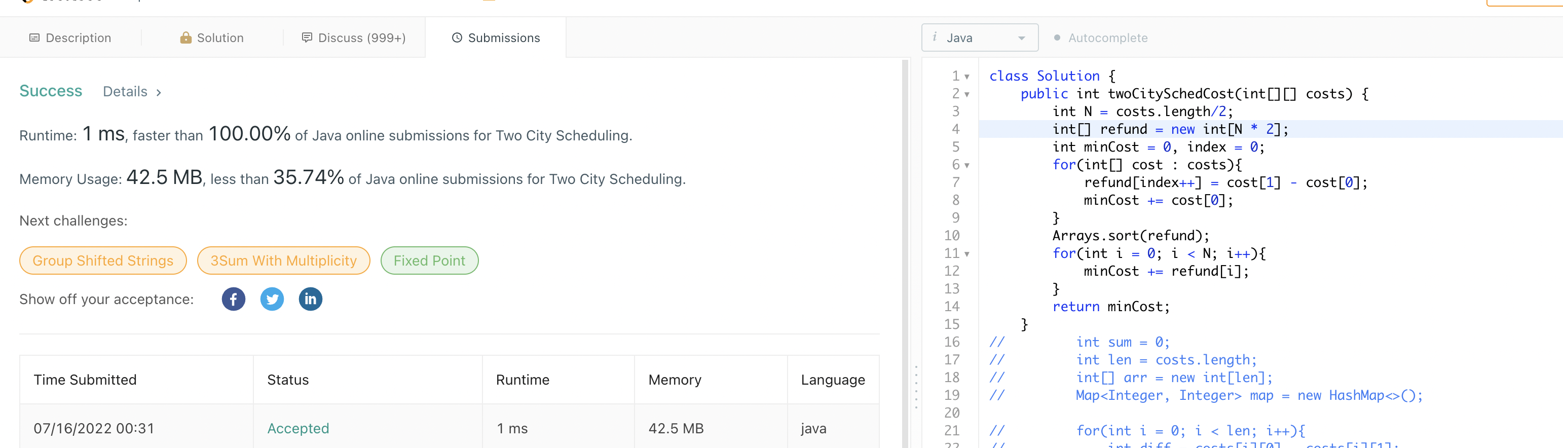 Input: costs = [[259,770],[448,54],[926,667],[184,139],[840,118],[577,469]]