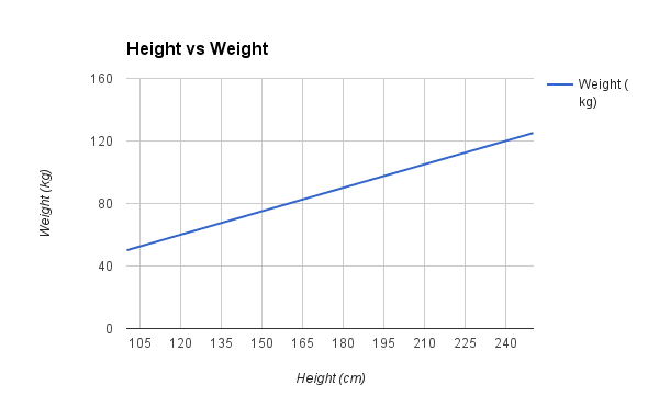 You can see that the above equation could be plotted as a line in two-dimensions. The B0 is our starting point regardless of what height we have. We can run through a bunch of heights from 100 to 250 centimeters and plug them to the equation and get weight values, creating our line.